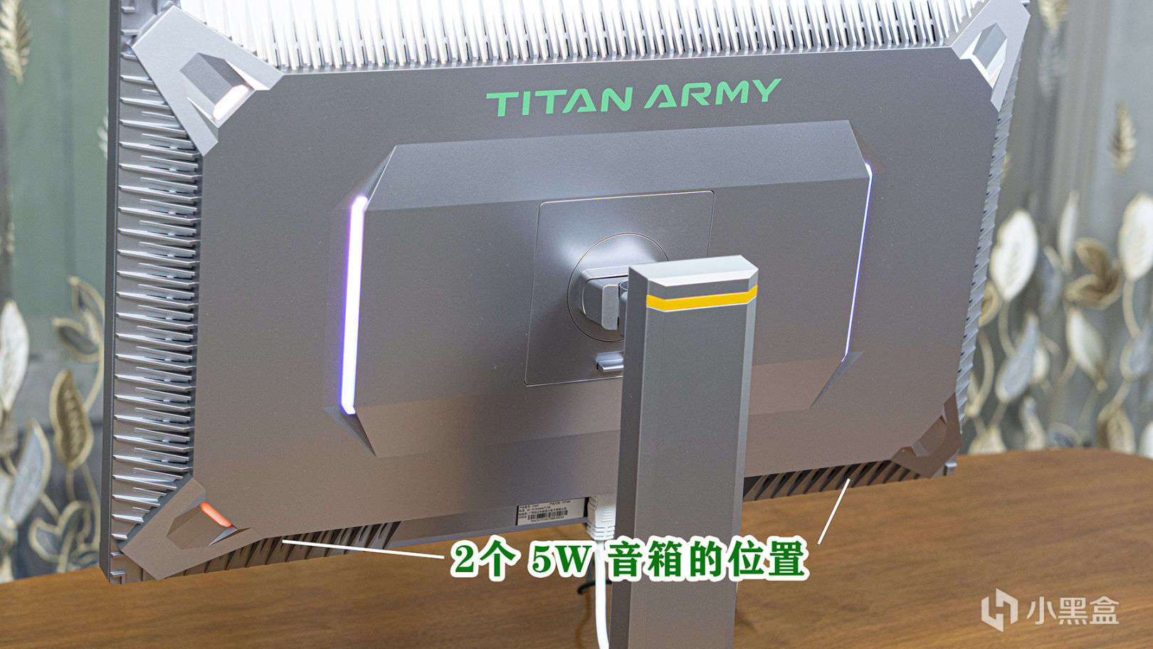 泰坦軍團P27A6V還內置了一對5W音箱,它的音色談不上絕美,但也接近平板電視的效果。內置的音箱,省去了我們單獨連線。當然,如果您對音質要求較高的話,還可以通過它的3.5MM音頻口,另外連接更好的音頻設備。