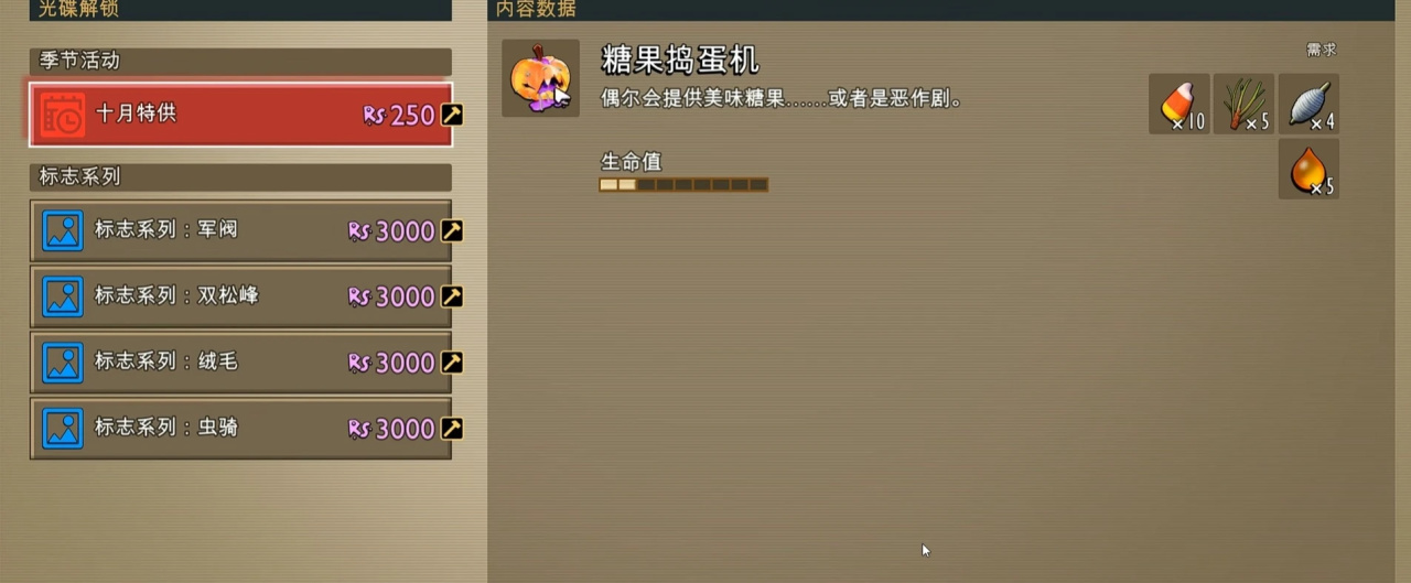 首先基地中可購買“不給糖就搗蛋”主題建築,上面也會寫十月提供,然後這個建築的一個核心材料是糖果玉米部分世界資源替換爲“糖果玉米”,這個東西原本沒有的,但他會暫時代替我們之前糖果的刷新,也就是說去糖果刷新點就可以獲得,而且玉米糖果敲起來稍微硬一些。
