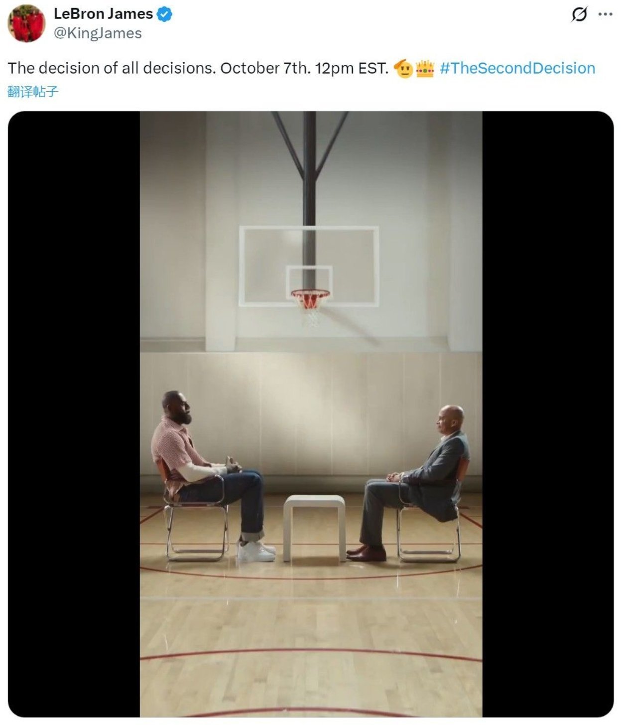 洛杉矶湖人队超级球星勒布朗·詹姆斯今日在社交媒体发布预告,宣布将于北京时间10月8日0点公布一项名为“第二次决定”的重大消息。视频中他身穿与2010年宣布加盟热火时相同的衬衫,配文“所有决定中的决定”。