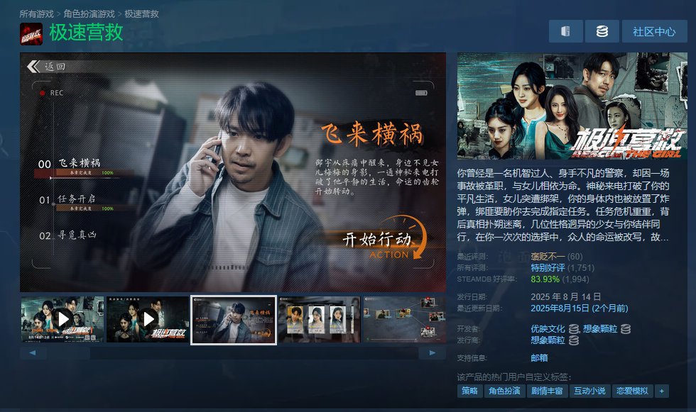 《極速營救》是由優映文化推出的一款懸疑題材的真人式互動影遊,遊戲開局講了玩家所扮演的角色是一個被革職了的警察,女兒被人綁架,綁匪要求完成一系列的任務,男主迫於無奈只能合作,一邊完成任務一邊追查綁匪的身份,在此過程中卻也逐漸陷入一個他人精心策劃的復仇的旋渦中。 遊戲在國產影遊中絕對是超高質量的那一批。故事劇本的劇情緊湊、邏輯嚴密。演員表演的真實且自然,形象非常飽滿。動作有專業指導拳拳到肉超爽。