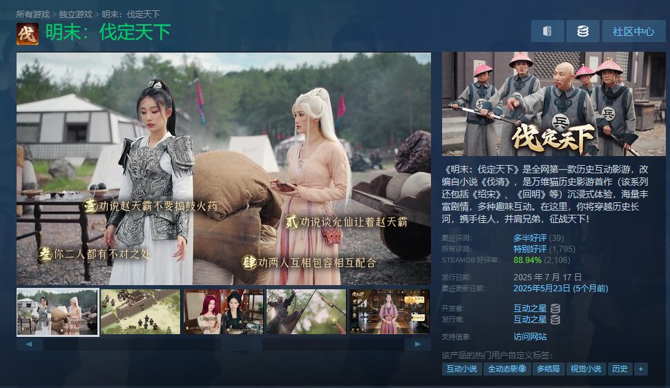 根據灰熊貓小說《伐清》改編的真人互動影視遊戲《伐定天下》,一部選用了明末歷史題材的穿越文,應該確實是第一部和歷史相關的影視遊戲了。本作的劇情很經典的爽文劇情,以男主這個擁有現代人身份,利用現代人的科學知識,穿越回古代引發一系列的風雲變動,流程比較長、文本量很多,只不過看爽文依舊不要過於追究細節了。姑且把遊戲掛在一旁,一邊無腦喫瓜刷劇,一邊看看男主的六位後宮美女養養眼,也不是不行。
