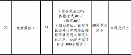 社会招聘中的消防战斗员及自动消防控制系统值班员岗位,体能考试成绩占比高达60%,考核项目包括3000米跑步和200米负重往返跑。包装操作工岗位体能占比30%,考核项目为男子1000米跑、女子800米跑。校园招聘中的酿酒操作工岗位同样要求体能测试,占比30%,项目为1000米跑步。而经济运行管理、人事专员和供应链管理等白领岗位未设体能考核。酒企招聘要求体能测试并非个例。2021年贵州茅台招聘制酒工、制曲工时,要求男子1000米跑、女子800米跑成绩在4分30秒以内合格。2022年贵州习酒招聘也规定博士以下学历需参加体能测试。