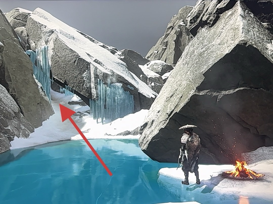 半路上会到一片结冰的湖面上,湖中央有一块大巨石,绕到湖中央巨石的背后,有一处篝火,然后旁边有条通往 山之庙 解谜的路,可以顺路去解锁一下,涉及到山之庙全收集奖杯。