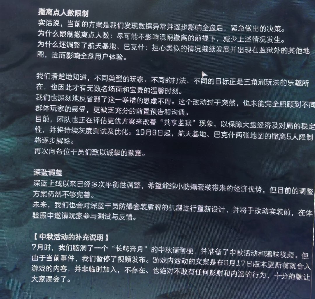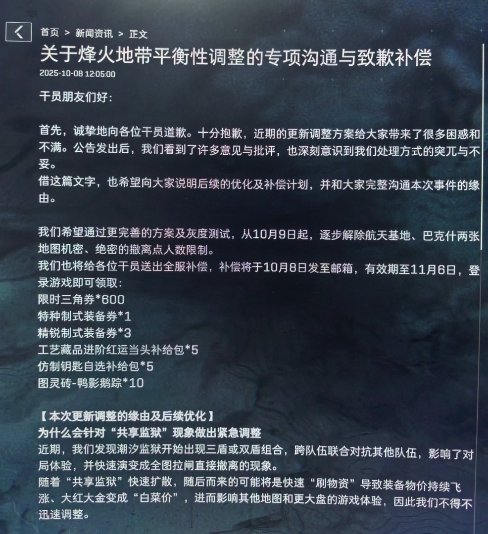 从 10 月 9 日起,逐步解除航天基地、巴克什两张地图机密、绝密的撤离点人数限制。补偿将于 10 月 8 日发至邮箱,登录游戏即可领取: