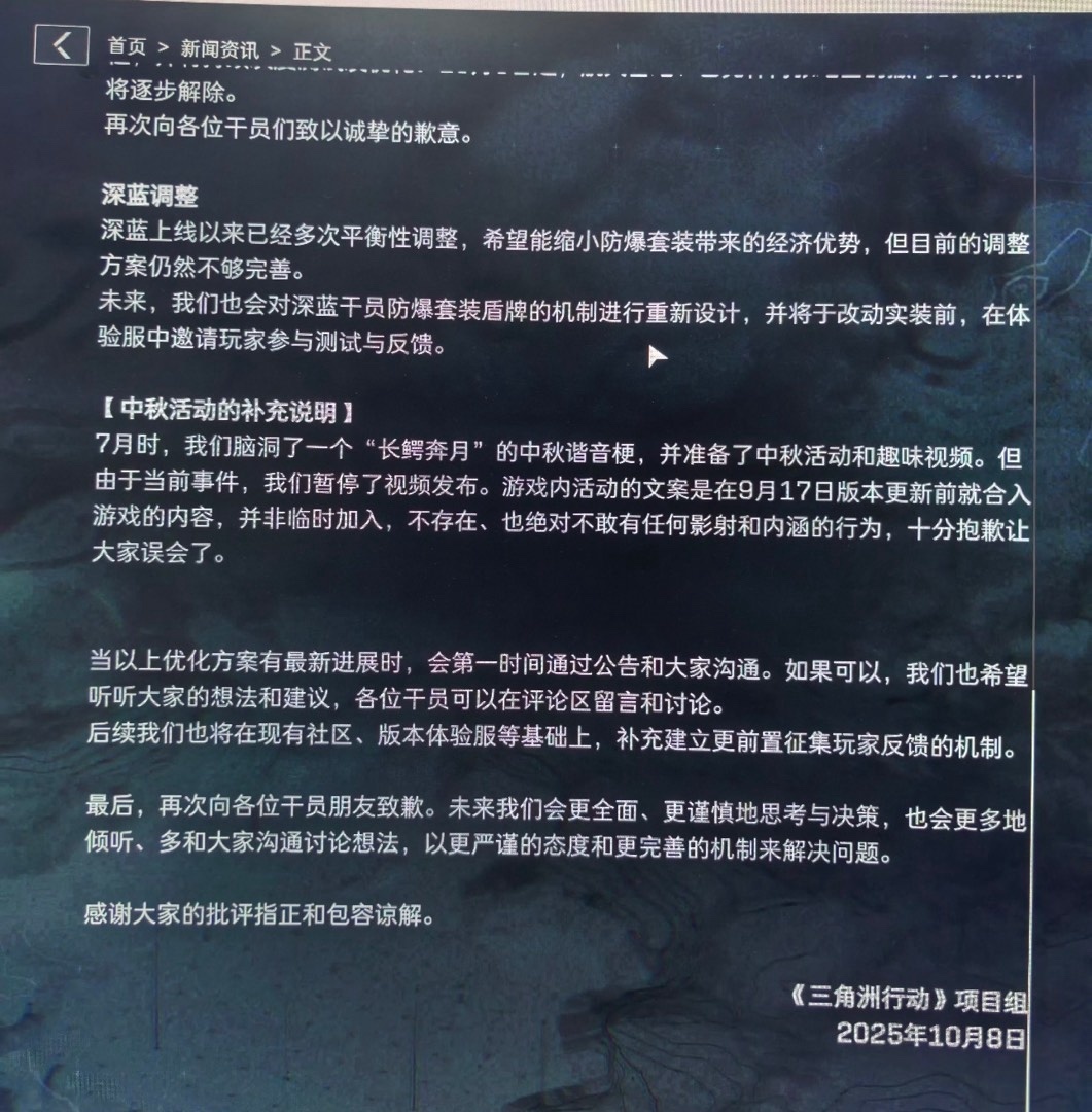 《三角洲》行动官方发表致歉,表示“近期的的更新调整方案给大家带来了很多困惑和不满。公告发出后,我们看到了许多意见与批评,也深刻意识到我们处理方式的突兀与不妥。”