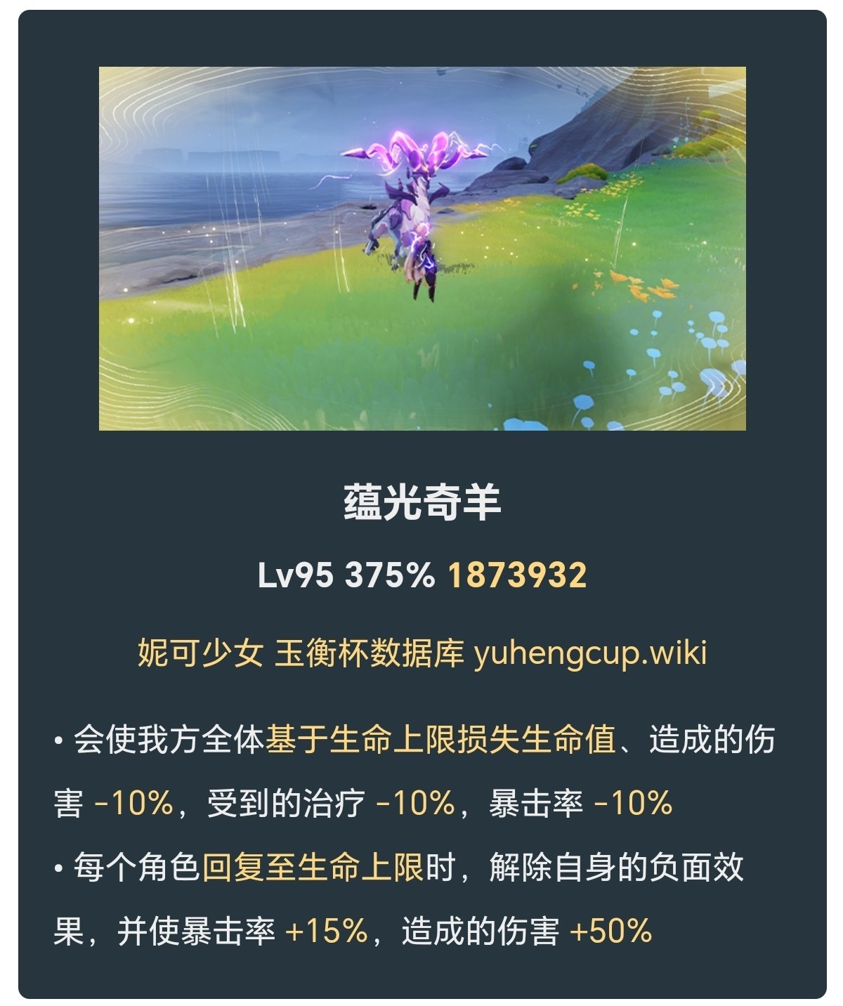 当队伍中的角色的生命值被回复至生命上限时,那个角色的上述所有负面效果立即解除,并使暴击率提升15%,造成的伤害提升50%。