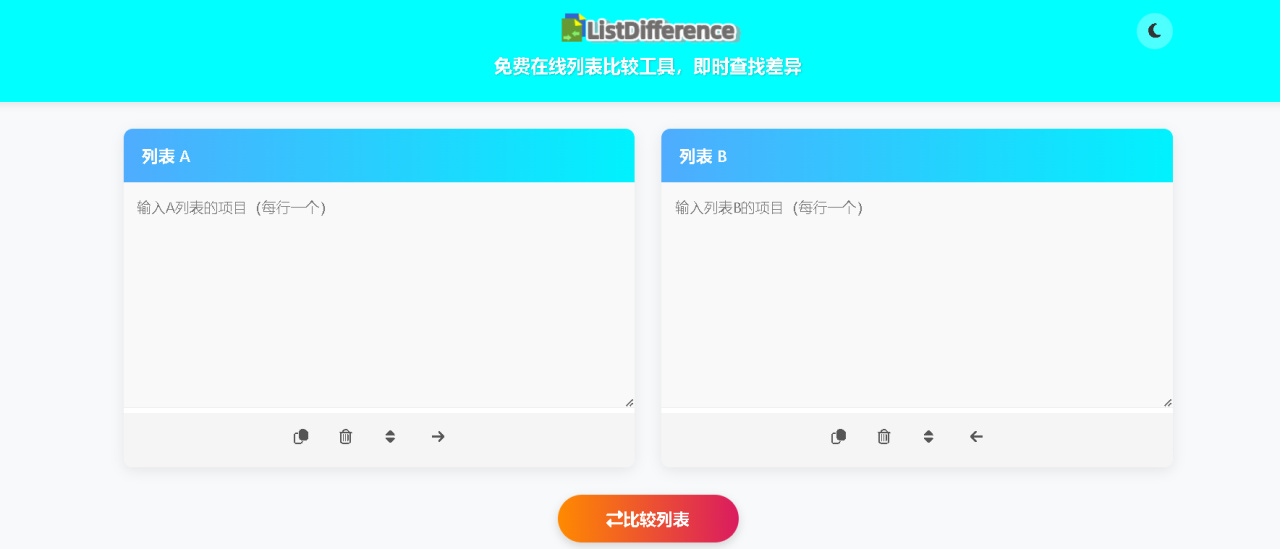 一个免费的在线列表对比工具,可以快速对比两组列表内容,突出差异项、共同项及唯一条目,适合用来购物、办公、学习等地方。
