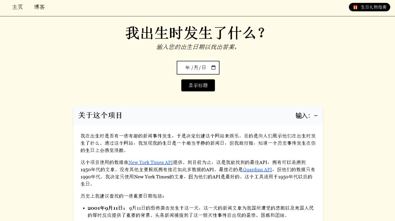 这是一个能让你查自己出生当天发生了什么的网站。通过输入出生日期,发现生日当天的新闻和重要事件。