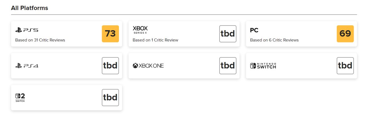 Metacritic(PS5端收录31家媒体评分,Metascore73分;PC端收录6家媒体评分,Metascore69分)