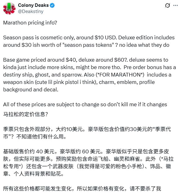 该内部人士将游戏定价描述为"相当标准",并将其与《绝地潜兵2》进行比较。据其称,豪华版将包含价值约30美元的"季票代币"。据称季票本身仅为外观装饰内容,每赛季价格可能约为10美元。他还报告称,每个赛季都会引入一名新的"奔跑者"。