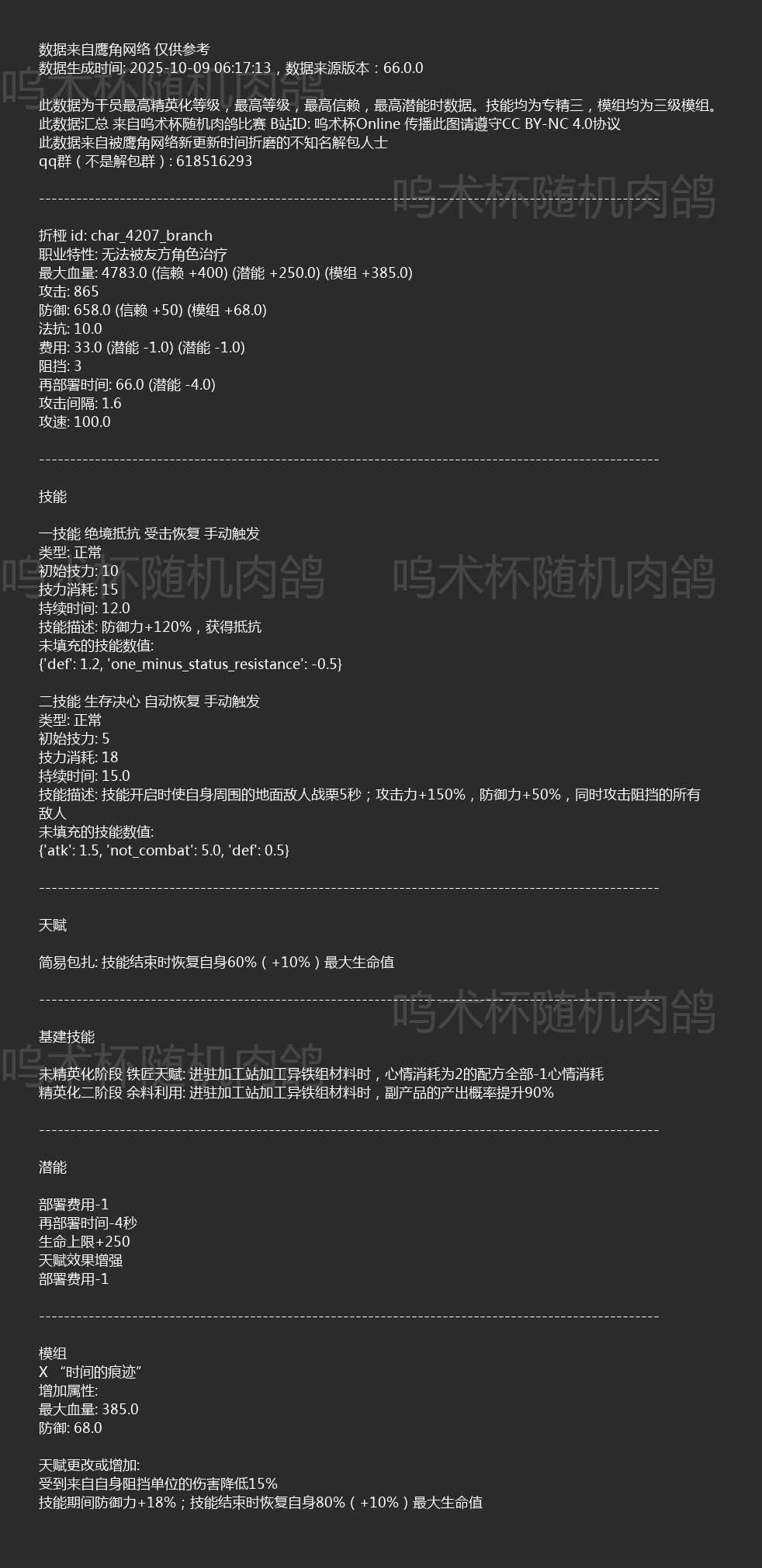冬时1技能7技力回3费有点拉了……有模组满潜+17攻速。2技能+40攻速停顿1秒。初动10秒持续9秒。