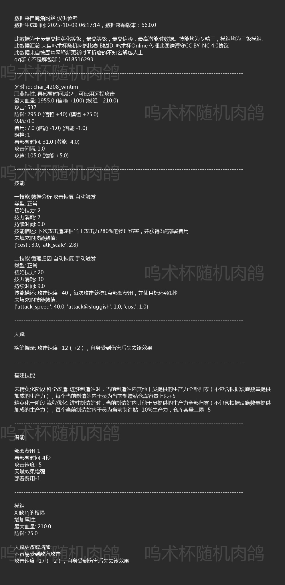 冬時1技能7技力回3費有點拉了……有模組滿潛+17攻速。2技能+40攻速停頓1秒。初動10秒持續9秒。