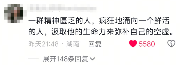 正如相关视频下流传甚广的一条评论:“一群精神匮乏的人,疯狂地涌向一个鲜活的人,汲取他的生命力来弥补自己的空虚。”