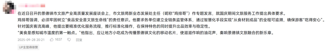 随着无数二创视频的引流,鸡排哥在互联网上得到更多的关注。许多人慕名而来,感受鸡排哥的热情与真诚。对当地文旅来说,这倒也是件好事——毕竟来都来了,不能光吃鸡排吧。更何况,马上就是十一假期,鸡排哥的爆火,正好能当作国庆旅游的卖点了。