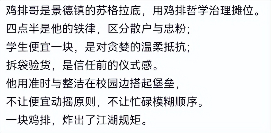 也许,只有在整场风波彻底结束后、在互联网上的人们将鸡排哥彻底忘却后,那个炸着鸡排的、充满笑容说着金句的、为顾客们提供满满情绪价值的鸡排哥,才会真正归来。