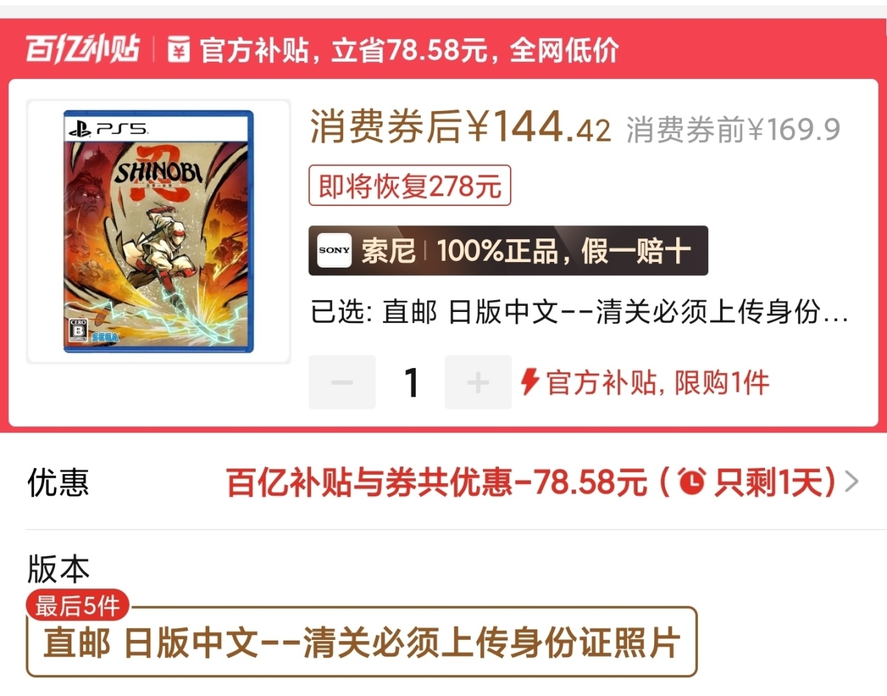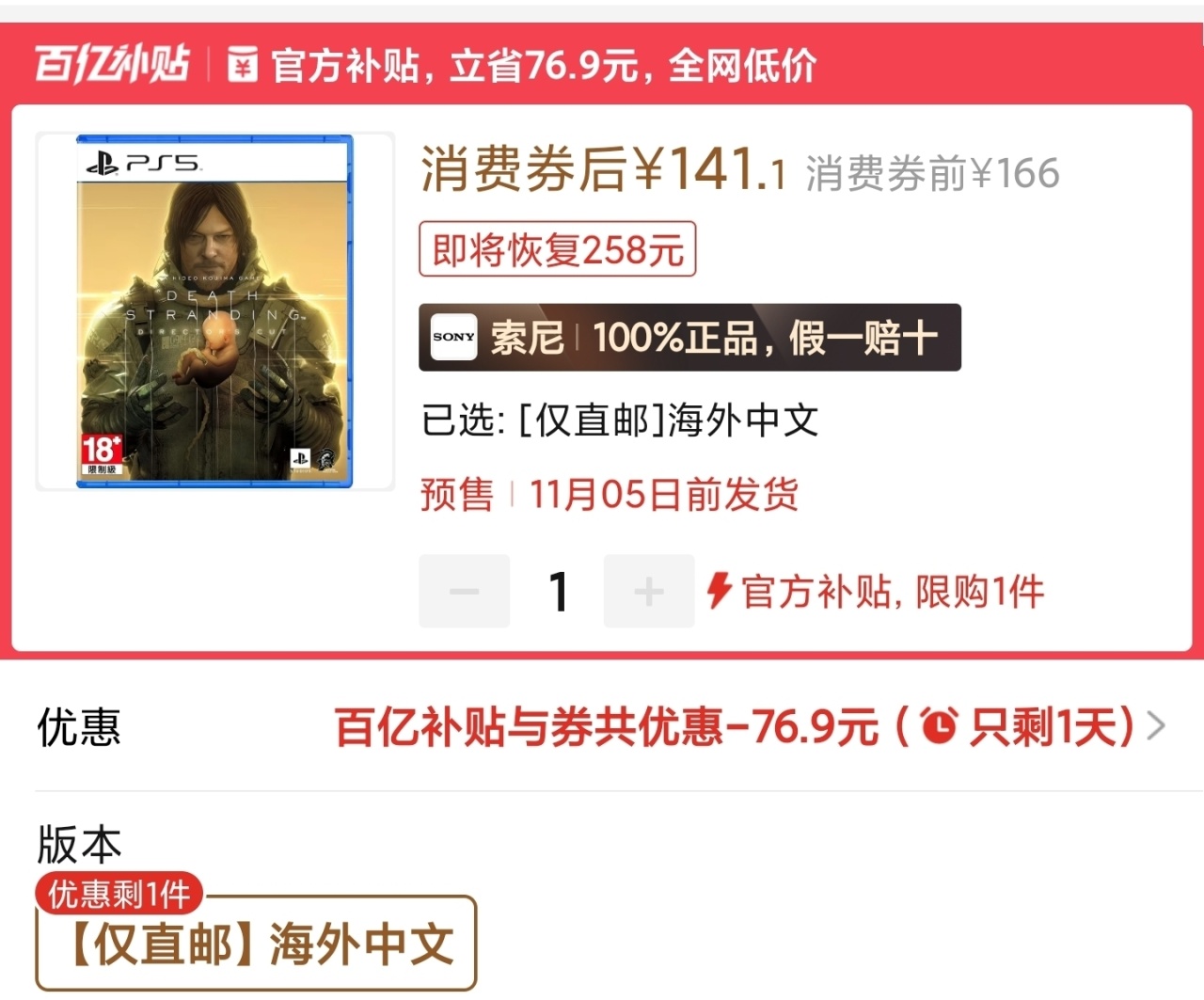 死亡擱淺海外版史低141,沒啥好說的,港版168,前幾天剛進補。有港版強迫症可以等港版。