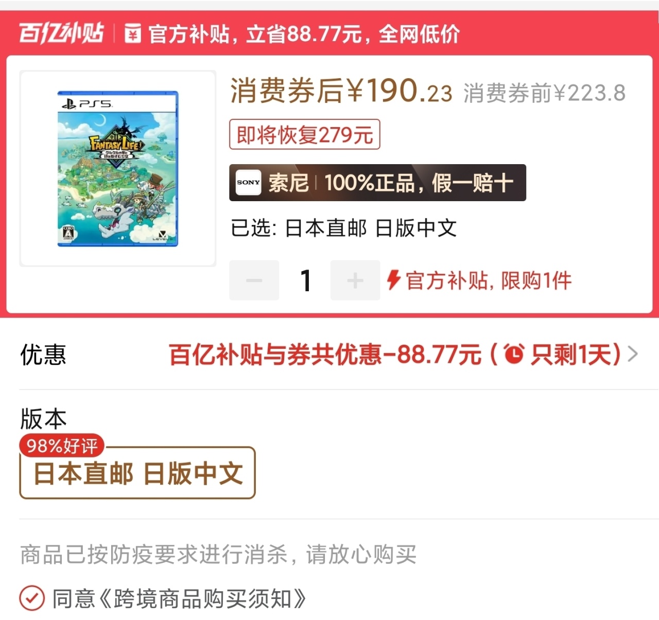 轉圈圈日版190,史低,發的中通國際大概四天到手,賊快。