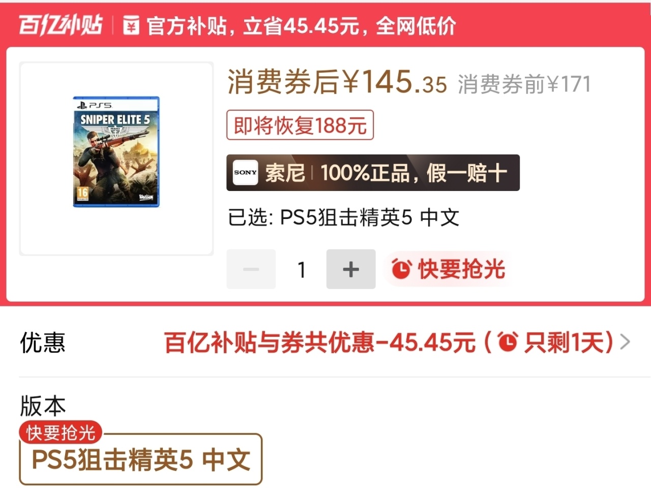 狙5史低,直接腰斬33塊錢,好玩可入價格不貴。