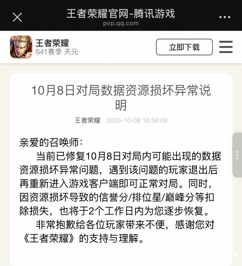 《王者榮耀》官網當日下午回應稱,“當前已修復10月8日對局內可能出現的數據資源損壞異常問題,遇到該問題的玩家退出後再重新進入遊戲客戶端即可正常對局。同時,因資源損壞導致的信譽分/排位星/巔峯分等扣除損失,也將於2個工作日內爲您逐步恢復。”