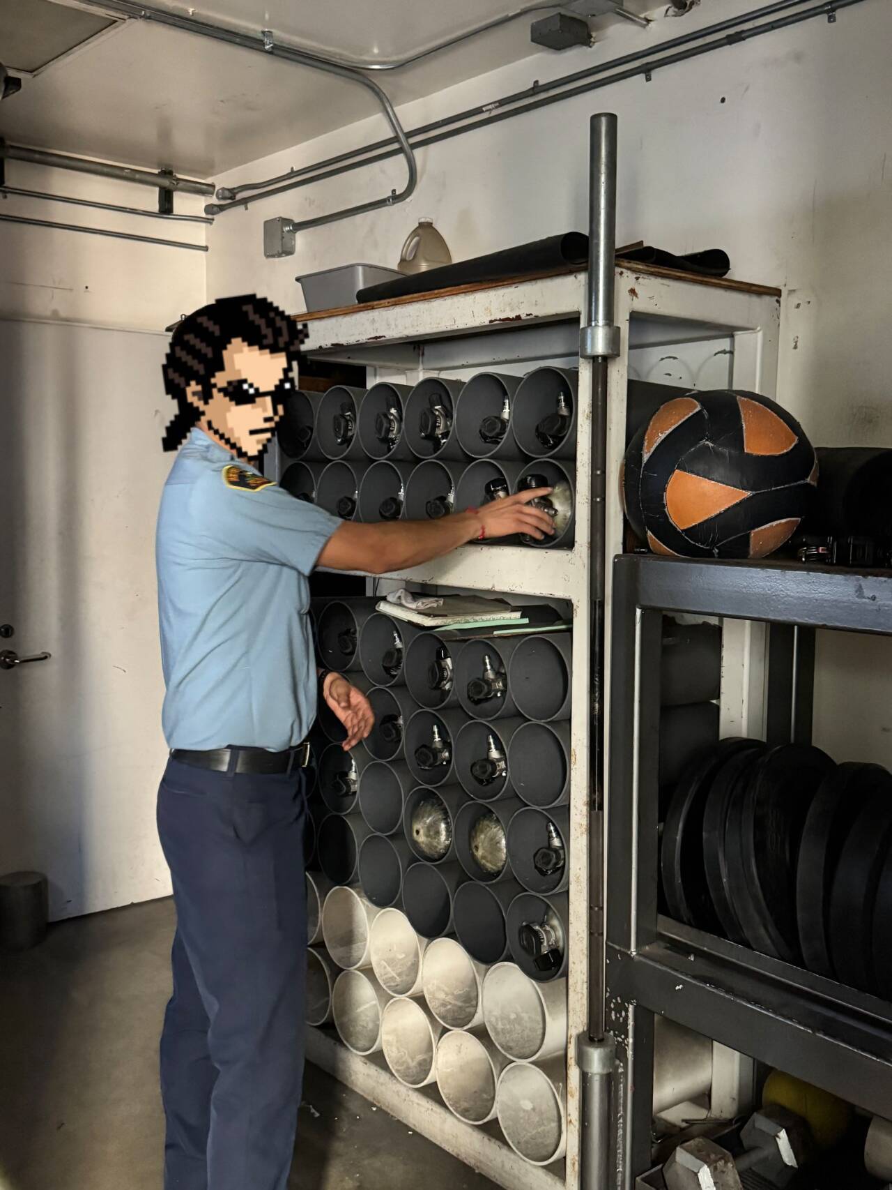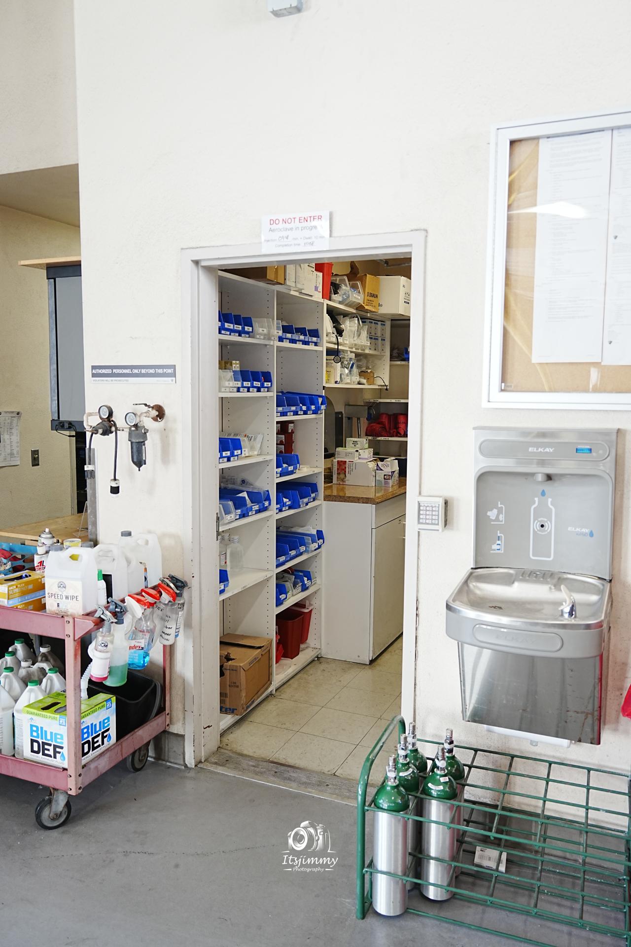 随后我在消防员的带领下参观了站里的医务室和加气室,这里的压缩机每15到25分钟就可以完成一批气瓶的充气,供消防员出勤或伤患救治使用. 充好气的气瓶码放在后方的架子上,消防员可以随取随用.