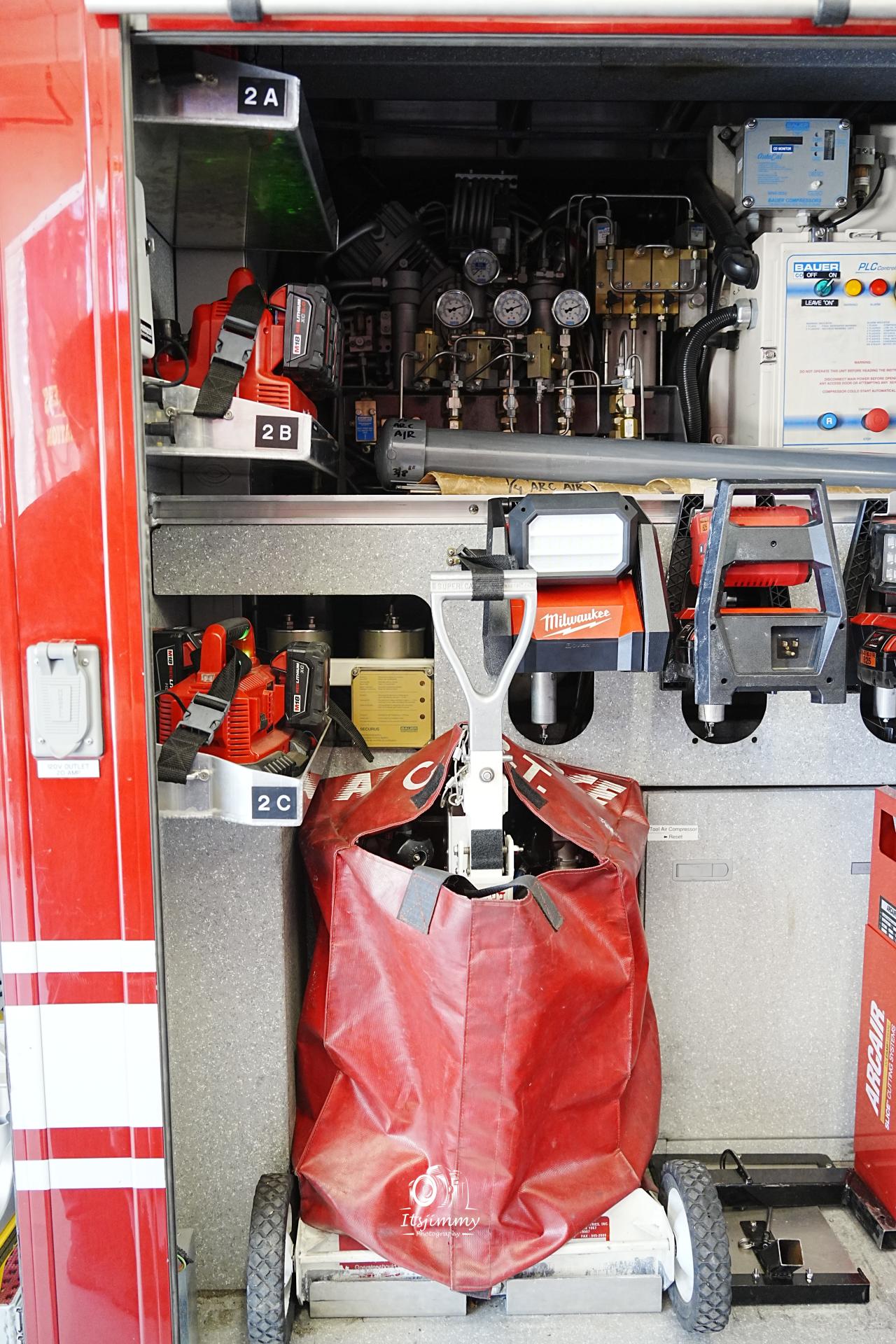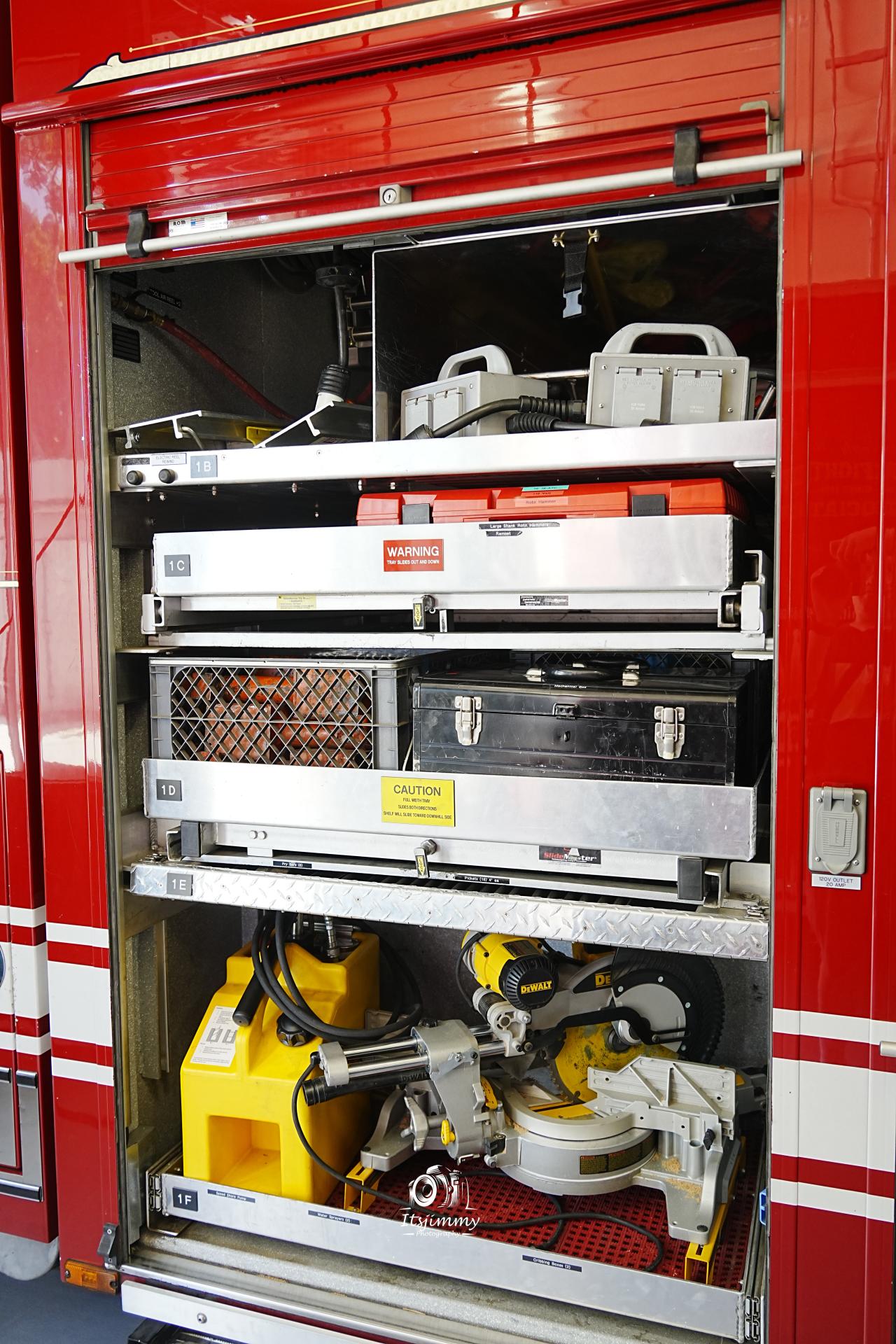 在两台塔梯的背后停放着BHFD的USAR. 当我问及这个缩写的含义时,消防员解释说这是"Urban Search And Rescue [都市搜救]"的缩写. 这辆车的任务如其名字一样,会在城市里出现灾情、有人员受困的时候出动响应,她身上携带着大量搜救和破拆工具,可以应对各种搜救情景.