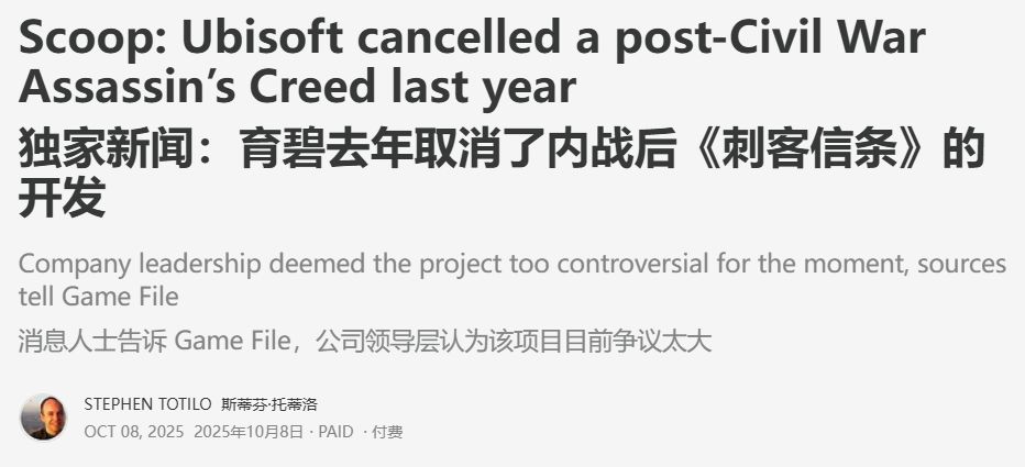 Totilo的报道来源于五位现任及前任育碧员工的匿名陈述,他们声称游戏取消主要基于两个原因。其一是育碧不希望重蹈《刺客信条:影》因包含黑人武士弥助角色而引发的网络争议。其二是管理层认为在美国当前政治环境下,发布具有此背景设定的游戏如同触碰"第三轨"(敏感议题)。