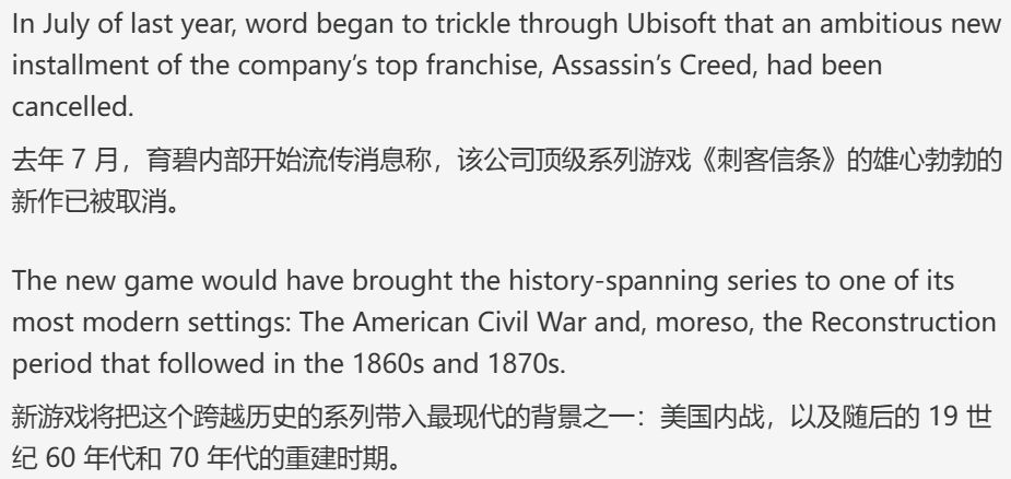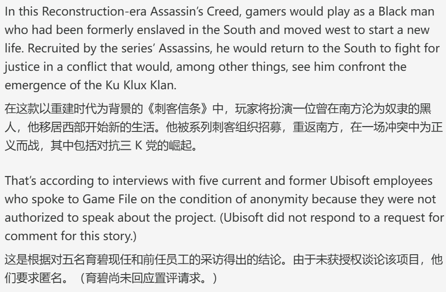 根据Stephen Totilo在Game File发布的付费报道,育碧取消的这款《刺客信条》游戏背景设定在19世纪,具体为后美国内战时期。玩家本将扮演一名在内战前于美国南方被奴役的黑人男子,战后在西部地区开始新生活。