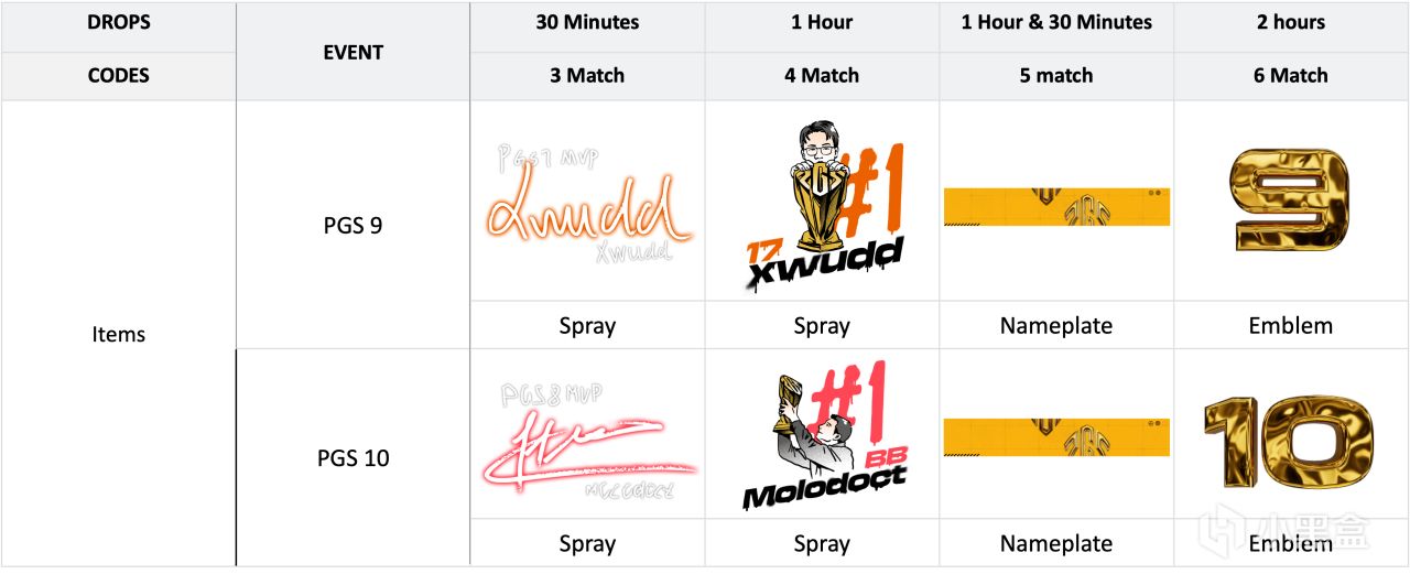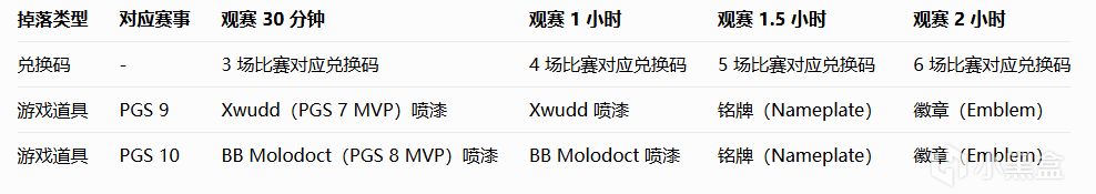 PGS 9 与 PGS 10 赛事期间,官方 “观赛掉落活动(Drops)” 回归(EP奖竞猜活动,年底的PGC才会有)!观众只需观看指定平台的赛事直播,即可免费获取绝地求生专属游戏道具,无需额外付费,仅需满足观赛时长条件即可解锁奖励。此外要说的是本次PGS奖励有主题以XWUDD的相关设计,也是世界赛上首次以选手相关进行的世界赛设计!