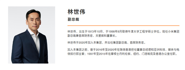 根據小米官網的高管團隊介紹,林世偉,出生於1973年10月,於1998年8月取得牛津大學工程學碩士學位。現任小米集團副總裁兼首席財務官、天星數科董事長。