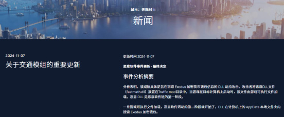 去年年底,《城市:天际线2》的模组“traffic”就被黑客植入了病毒,官方紧急下架了该MOD,并火速发出公告。公告里详细说明了木马文件的位置,中招的玩家需要用杀毒软件正确删除文件,并且修改电脑上储存的所有账户密码组合,才算暂时安全。