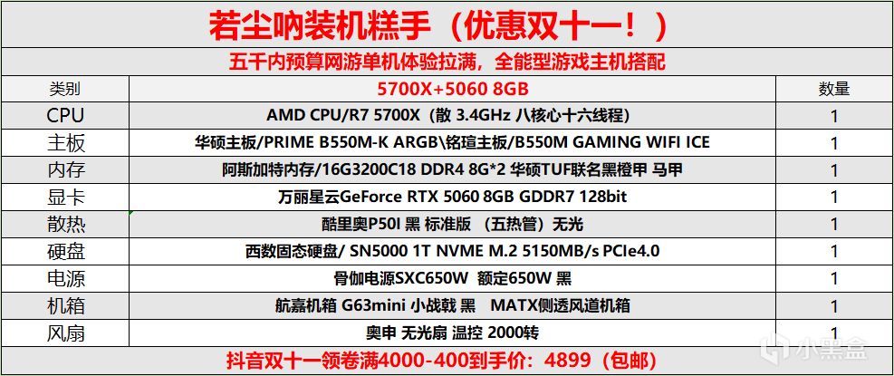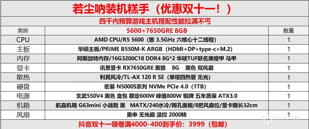 本期推荐是专门的抖音双十一期间本店恰饭推荐,所以价格可能就没有我每个月发的不恰饭配置推荐价格那么理想化了喔,本次双十一分三个阶段,本月九号到十四号是第一阶段,满减卷我这边跟DIY主机有关的就是满4000-400的卷,目前盒友群已经让一千多个盒友尝试过了,基本每个人都能领到,所以第一波大家不用担心没有卷了,不过还是要提醒,如果跟618一样高开低走,后面可能卷就会限量发放,盒友记得及时领卷,抖音商城点进去他肯定就有弹窗,一点就领到了。