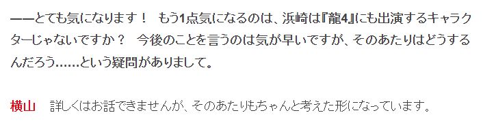 今日,Fami通对如龙制作人横山昌义进行了采访,当被问及“《如龙:极3》的角色滨崎豪也会在《如龙4》中登场,这方面会如何处置”时,横山昌义回答到具体细节虽然不便透露,但关于这部分已经做了充分考量。
