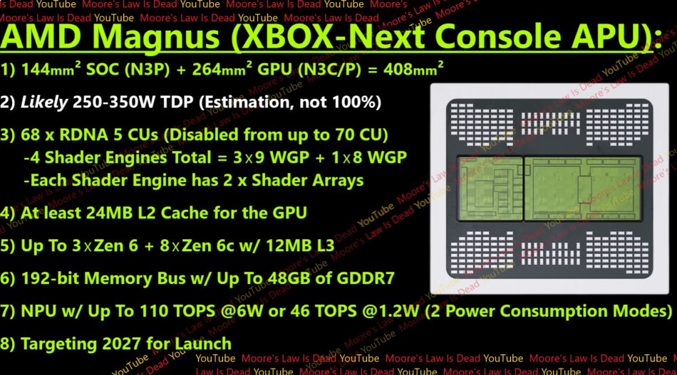 代号为"Magnus"的下一代Xbox主机系统级芯片(SoC)的早期照片疑似遭到泄露。在其最新YouTube视频中,内容创作者兼硬件内部人士"摩尔定律已死"分享了他声称是下一代Xbox Magnus SoC的照片(见下图)。他还深入分析了该芯片的泄露规格,并将其与传闻中的PS6规格进行了对比。