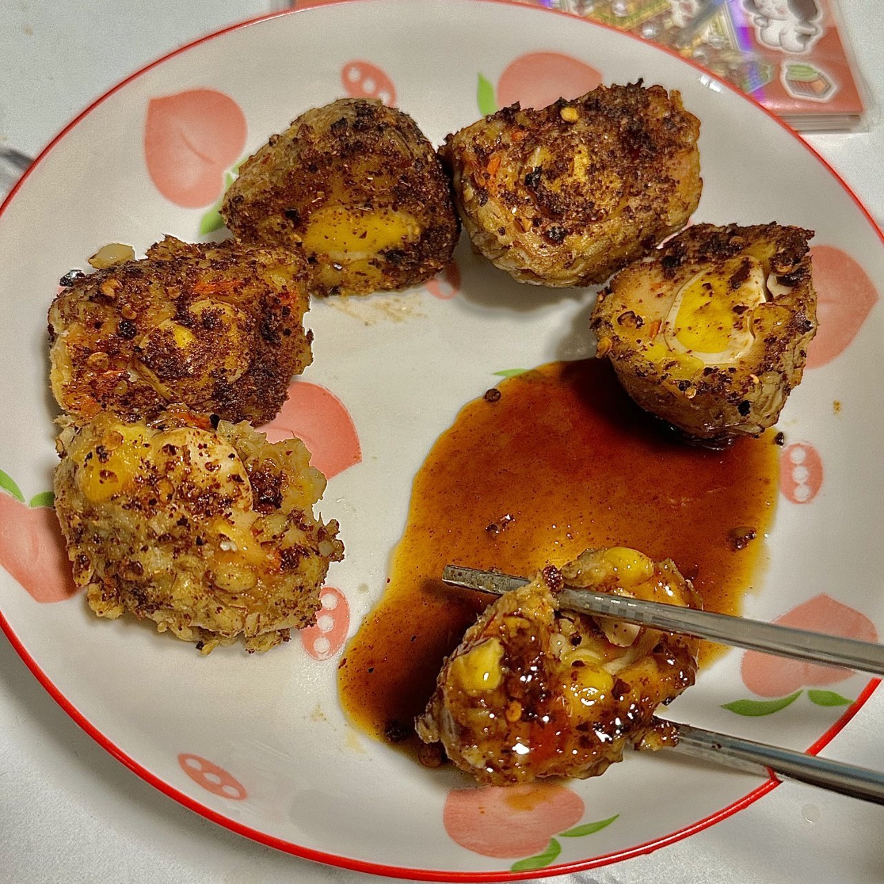 这是空气炸锅喷油,撒了沾鞋底都好吃的单山蘸水,正反面烤5分钟之后,再沾烧烤酱吃,看起来还行,吃起来也是勉勉强强能入口。