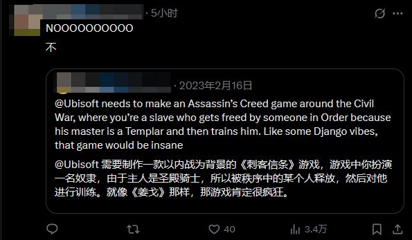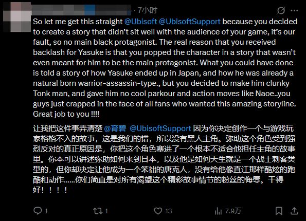 许多玩家对取消决定表示失望,认为这个设定比弥助更合理。有玩家提到昆汀的电影《被解救的姜戈》,其背景同样取材自南北战争前后。还有玩家回忆起《刺客信条4:黑旗》的DLC“自由呐喊”,其中玩家扮演黑人刺客阿德瓦勒,帮助摧毁海地地区的奴隶制。这证明育碧曾经成功处理过类似题材。