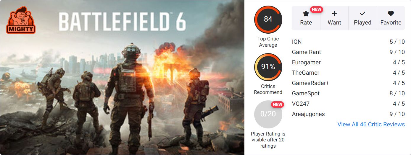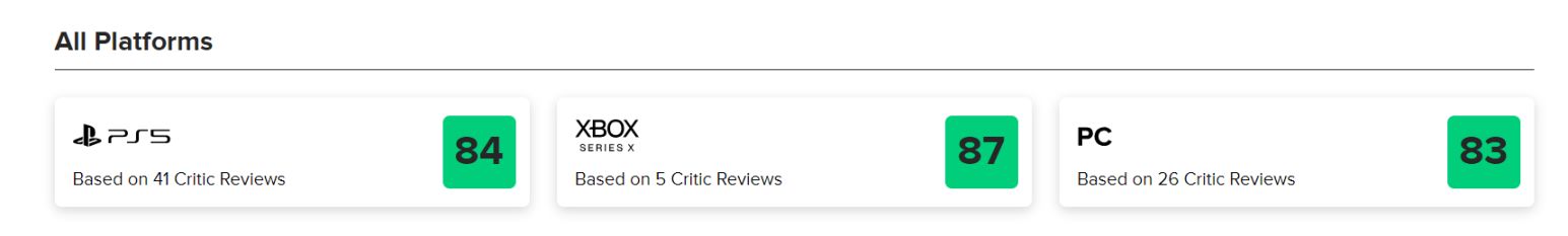 Metacritic(PS5端收录41家媒体评分,Metascore84分;Xbox端收录5家媒体评分,Metascore87分;PC端收录26家媒体评分,Metascore83分)