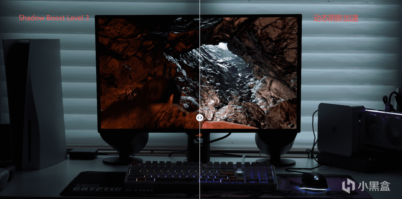 ▲除此之外,Shadow Boost動態陰影增強,也就是暗部細節提升功能也十分重要,比如黑暗場景的槍戰等等,LYB的偷襲可以說防不勝防,而開啓了動態暗影增強之後,它可識別並自動提升遊戲暗部區域場景亮度,而遊戲亮部區域不變,這樣即可讓遊戲暗部細節視覺更清晰,也不會改變遊戲整體氛圍,也容易發現藏在黑暗中的對手,無論是玩家還是NPC,都無所遁形。上圖爲《古墓麗影:暗影》的開局,分別使用了Shadow Boost關閉擋與Shadow Boost 三檔以及動態陰影增強進行拍照,並用NVIDIA的ICAT軟件進行實時比對,大家可以看到開啓Shadow Boost後岩石的紋理變得明顯更加清晰可辨認,而開啓動態陰影增強後,畫面的暗部亮度提升更加明顯,多個擋位足以適應不同遊戲選擇。
