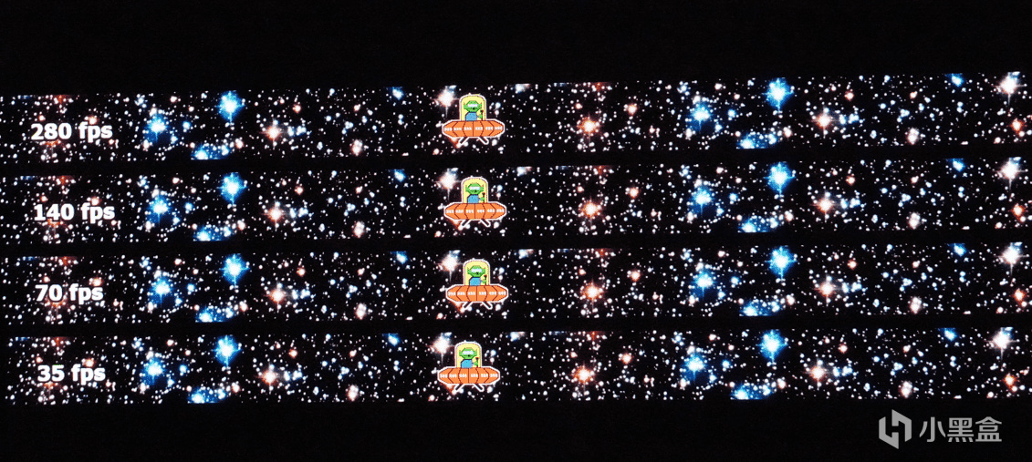 ▲關於爲什麼要使用高刷新率的屏幕,我們直接用UFO Test的屏攝(1/1000秒快門)進行介紹,在UFO test網頁中可以生成最高刷新率(280 fps),50%刷新率(140 fps),25%刷新率 (70fps)與12.5(35 fps)刷新率下的UFO軌跡。通過上圖可以非常明顯的看出:刷新率越高,畫面顯示物體位子變化越及時,圖形距離目標真正位置越近,玩家能夠更好的打擊敵人,而非去描邊敵人的虛影。更重要的是,即使刷新率高達280 Hz,華碩ROG 超殺27的畫面也毫無虛影、鬼影現象的發生,表現非常好。