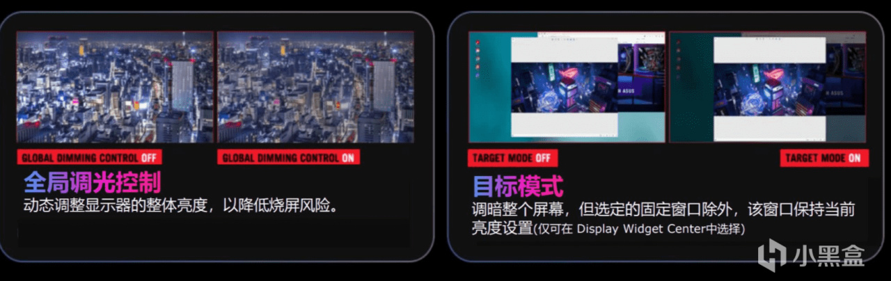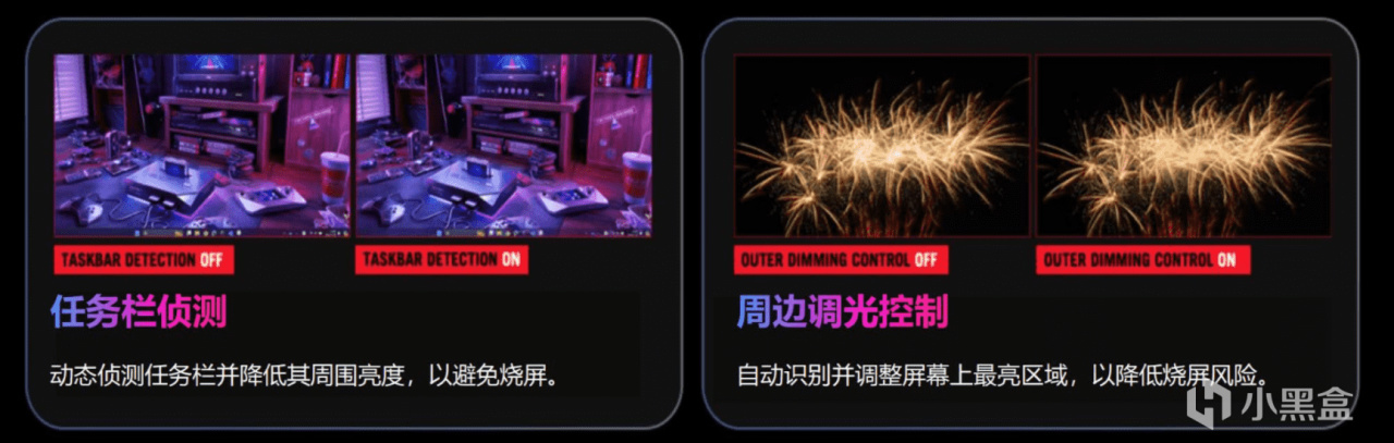 整個OLED 屏幕保護Pro技術內含許多子功能,主要可分爲像素清潔、畫面移動等主動保養;目標模式、調整標誌亮度、任務欄偵測等針對性保護,以及全局調光控制、周邊調光控制這類AI亮度優化共三大類的屏幕保護技術,配合起來能讓大家安心選擇OLED屏幕。