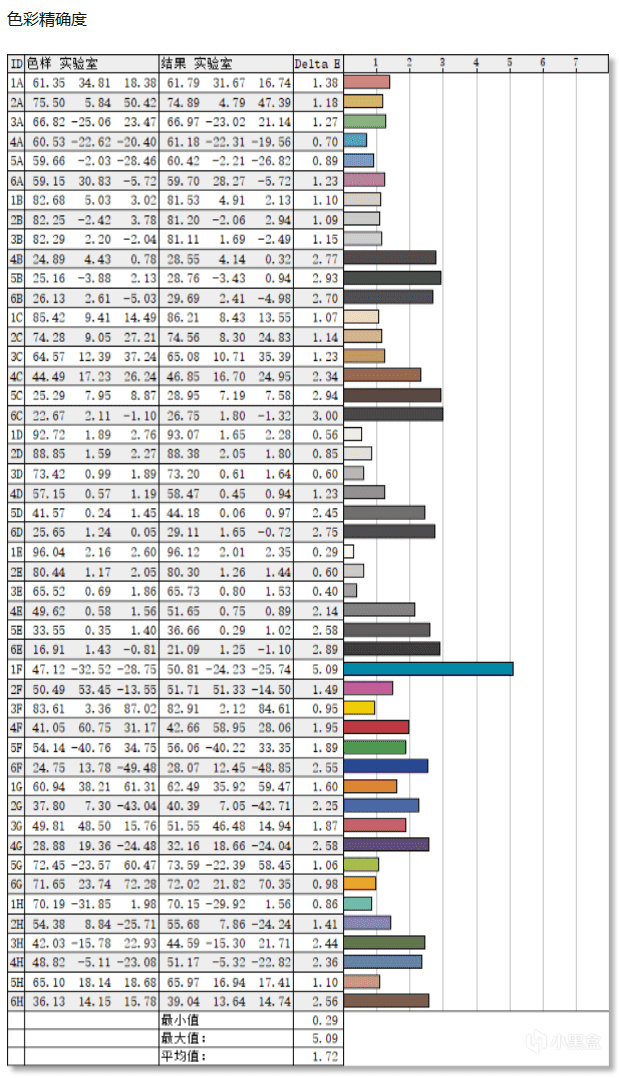 ▲色準方面,華碩ROG超殺27電競顯示器表現也比較不錯,平均ΔE爲1.72,步入了專業顯示器的門檻,而最大ΔE爲5.09,爲1F藍色。