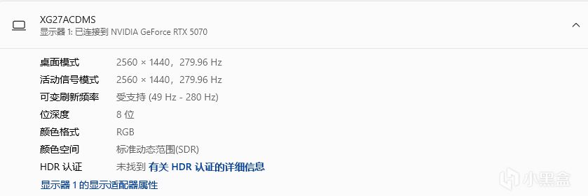 首先我們自然要關注280Hz的超高刷新率,將顯示器與RTX 5070顯卡連接後,顯示器便可以以QHD(2560x1440)分辨率,280Hz刷新率下顯示畫面(需要在顯示器電源設置中調整到性能模式,節能模式刷新率上限爲240Hz),默認色深爲8bit,可以在NVIDIA控制面板調整爲8 bit抖10bit。