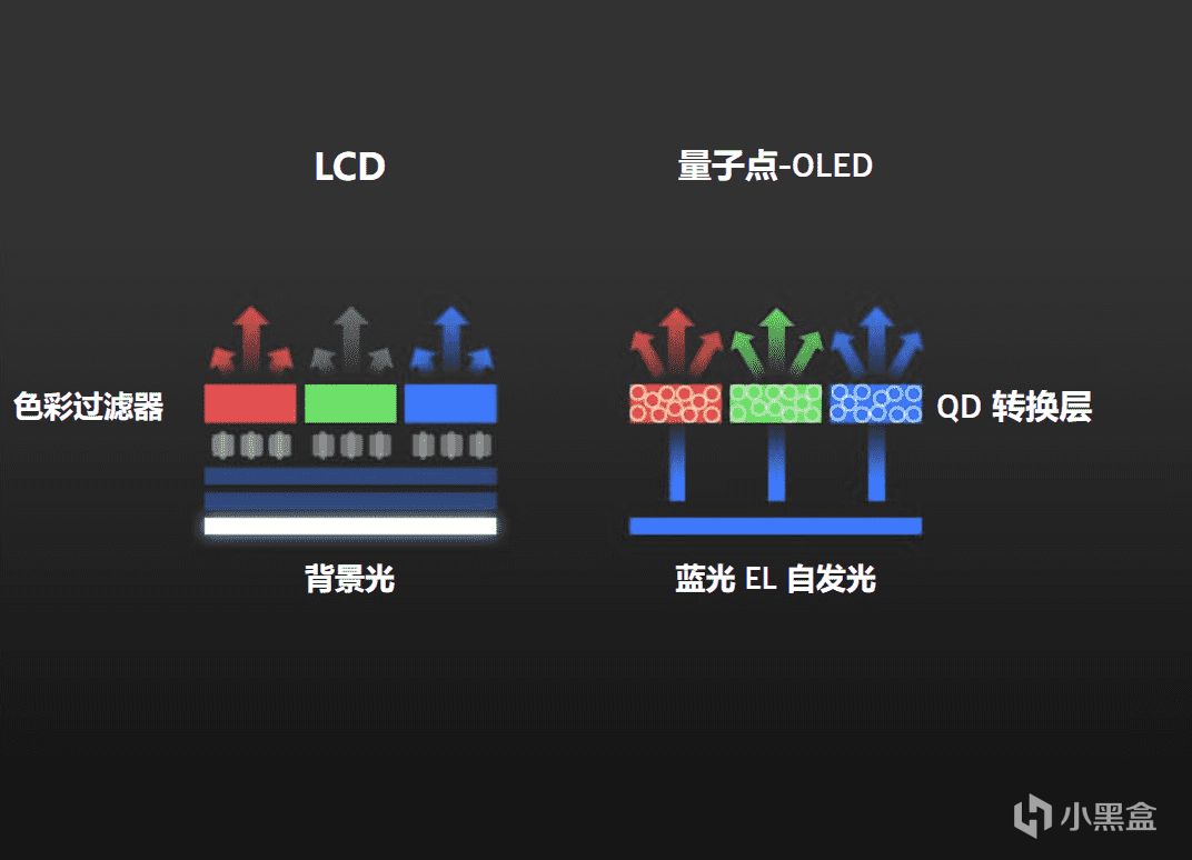 ▲我們先來簡單介紹一下QD-OLED屏幕,它又稱量子點-OLED,其實也是OLED的一種,其由可以發出高強度光線的藍光EL自發光層與量子點QD轉換層組成,QD轉換層會將藍光EL發光層的光源按照畫面內容全部轉換爲紅綠藍三原色而基本無損耗。