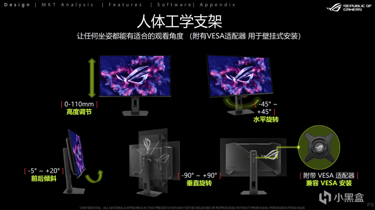 ▲最後,顯示器支架支持上下0-110mm高度調節,左右45°旋轉、前後-5°-20°角度傾斜,以及顯示器±90°的垂直旋轉,這些都屬於高端顯示器所帶支架的基本操作,我就不做演示了。