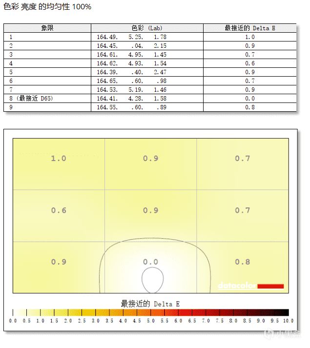 ▲色彩 亮度均勻性方面,華碩ROG超殺27表現得也一場優秀,最大ΔE也僅爲1.0,整個屏幕沒有一個往橙色走的象限,可以說大廠就是大廠,其品控之高是小廠根本無法企及的。