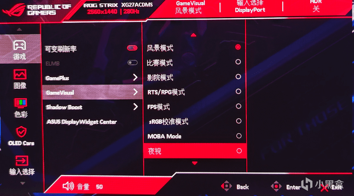 ▲而在GameVisual菜單中的畫面模式非常之多,你知道嗎,ROG超殺27甚至提供了夜視選項,開啓後畫面猶如帶了夜視鏡,尤其是某些FPS的夜戰場景,讓你從開局便佔盡優勢,別提多爽了,這個夜視功能在絕大多數顯示器中都沒有實裝,可以說是ROG顯示器的獨門殺手鐧之一。