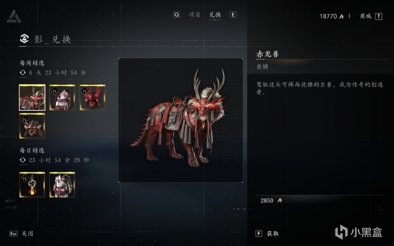 本周依旧五个周常任务,本体四个任务,DLC一个任务,兑换商店已更新。赤龙兽坐骑,十分值得一换。更新时间是凌晨,但商店已更新。 以下本周免费兑换的其余商品: