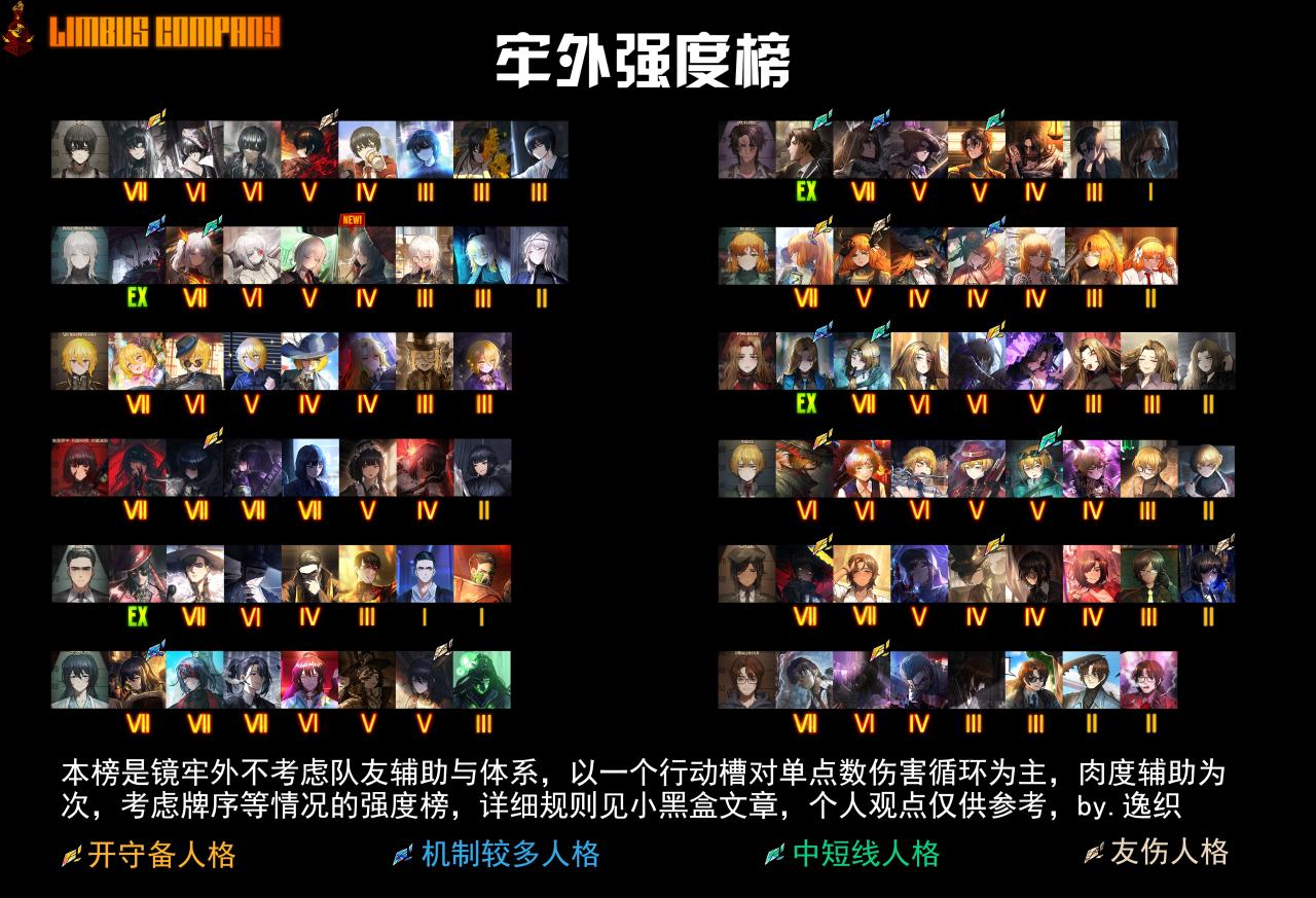 榜單以牢外點數傷害按比例合計算分,點數過低扣分,肉度與泛用輔助加分,不考慮體系,無隊友輔助單槽對單六回合循環爲主,十二回合循環爲次,點數傷害計算攻防等級,考慮牌序與理智,流血沉淪破裂默認疊不起來,燒傷震顫層數消耗僅計算自身觸發的,不進行可能造成友傷的循環,隊友默認每回合提供每種罪孽資源各1個,常駐2種debuff,僅給需要罪孽共鳴的人格提供2共鳴,不考慮ego。