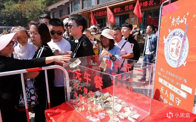 现在每天的午餐由景区职工厨师制作,有糊涂面、馒头、卤豆腐这些家常吃食,每天准备 3000 份左右,都是按客流量算好的。现场没人收钱,游客自己投币或扫码,想找零也自己来,景区觉得这是对游客的信任,而多出来的钱,大概率是有人故意多投或者没找零,这让他们觉得特别暖心。