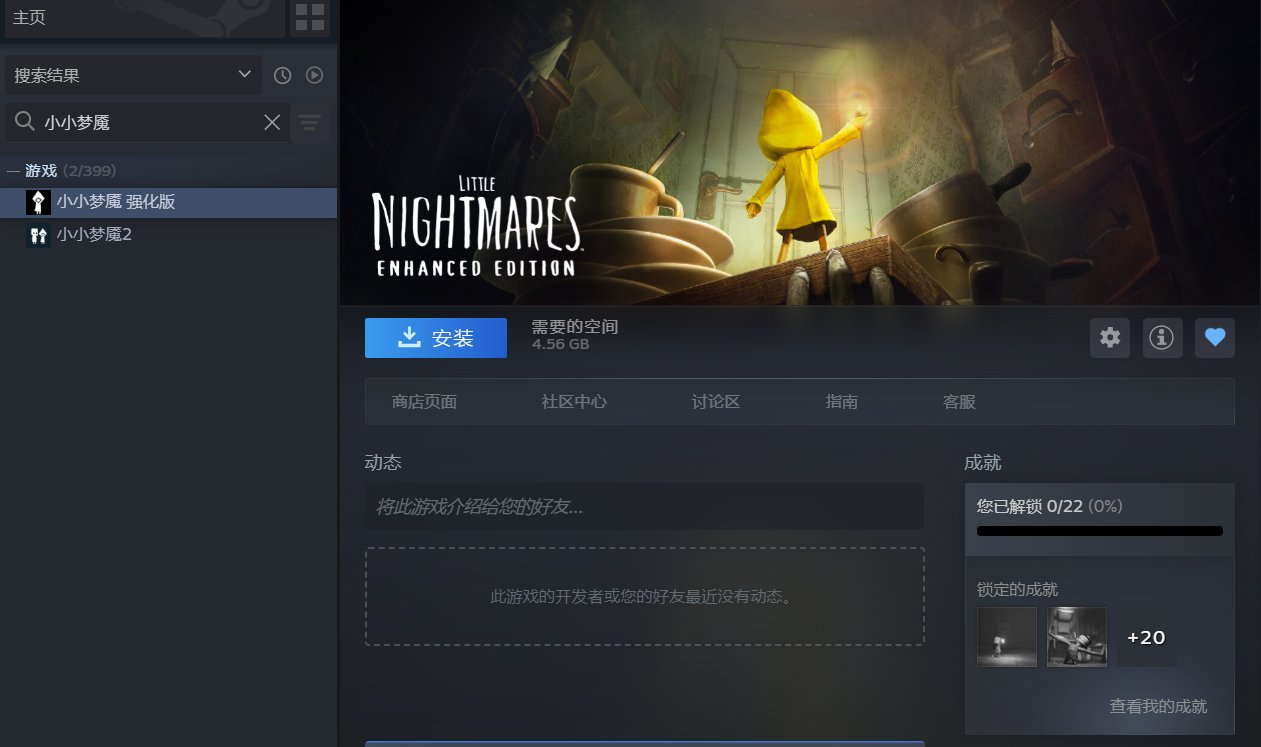 《小小梦魇3》今早6点在Steam平台正式解锁发售,拥有《小小梦魇》(2017)的玩家Steam库中也已自动入库《小小梦魇:强化版》,大家可尝试在库中搜索是否已入库。