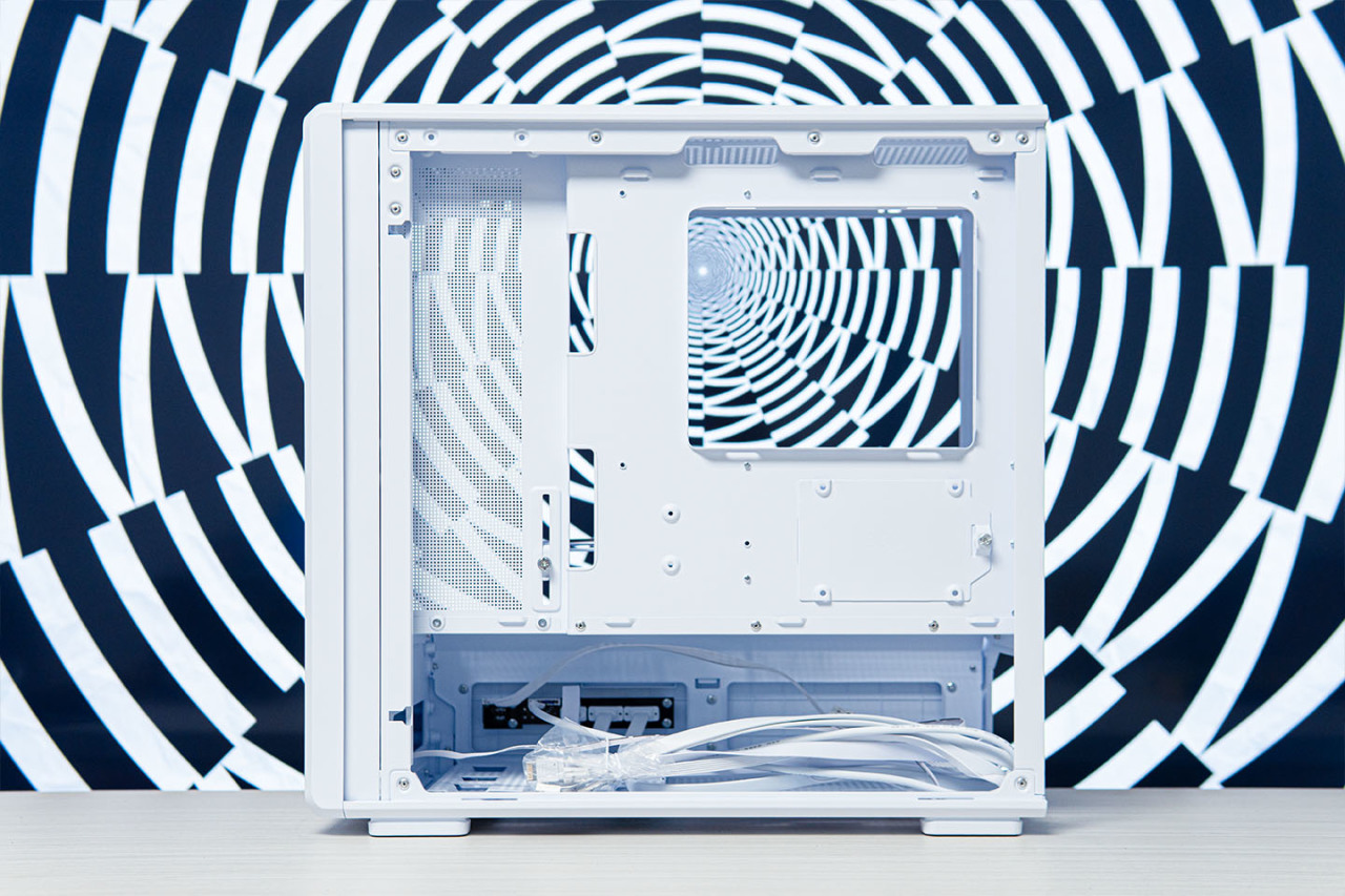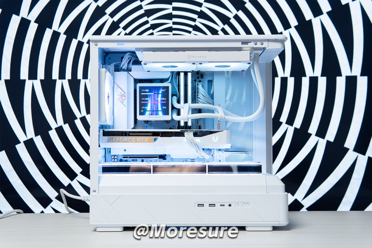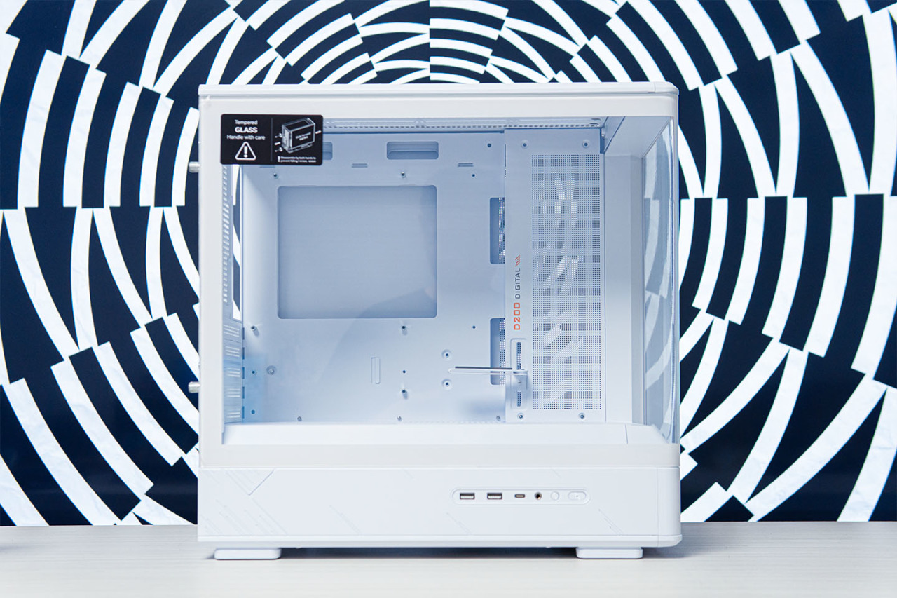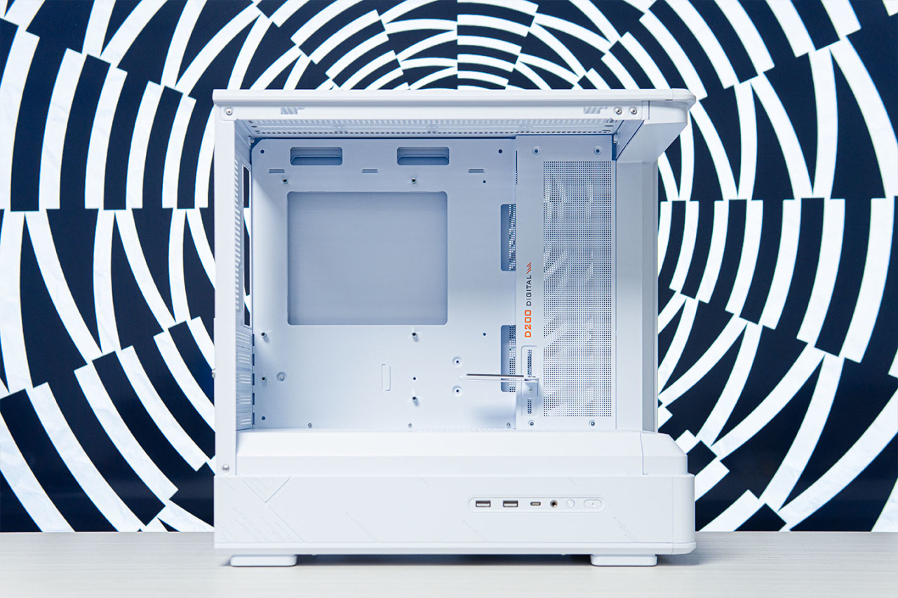 作为MATX机箱,乔思伯D200使用上下分仓结构,整机比较小巧,一体曲面玻璃使得内部硬件展现无割裂感,纯白色和显卡、主板、内存等硬件也比较好搭配,机箱内部的空间还算宽裕,装机走线没有难度。
